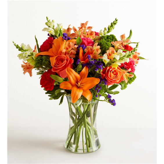 Putting a bright start in somebody’s day starts with a beautiful gift. Our delightfully vibrant bouquet is filled with a medley of blooms in cheerful pops of orange, hot pink and yellow, with plenty of lush greenery mixed in. Designed by the talented Breanna Cartwright from Fresh Ideas Flowers Company in Modesto, California, it’s the perfect pick-me-up surprise, whatever the sentiment.